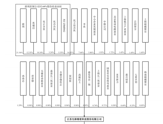 先锋精科的控股股东、实际控制人为游利,IPO前,游利直接持有公司21.36%的股份,通过英瑞启、优正合伙、优合合伙及与XU ZIMING之间的一致行动关系间接控制公司31.29%的股份,合计控制公司52.64%的股份表决权,游利还是公司董事长兼总经理。