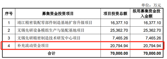 据先锋精科的此前招股书,公司拟募资7亿元,募投项目包括靖江精密装配零部件制造基地扩容升级项目、无锡先研设备模组生产与装配基地项目等四个项目,其中2.08亿元拟用于补充流动资金。