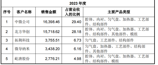 其中,中微公司已连续两年成为公司的第一大客户,2023年、2023年占营收比重分别为37.8%、29.4%,2024年一季度占比为34.07%。
