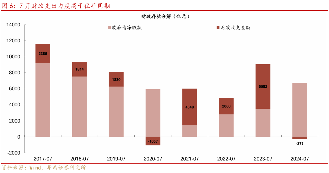 此外,财政存款反映财政支出力度或高于往年同期。7月新增财政存款6453亿元,与过去五年均值基本相当,用财政存款剔除政府债净缴款计算财政收支差额,得到今年7月财政收支差额(收入减支出)为-277亿元,即支出大于收入。7月并非财政支出大月,而是缴税大月,财政收入差值通常为正,过去五年均值为2593亿元,而今年7月罕见为负,可能主要是财政支出边际加快。