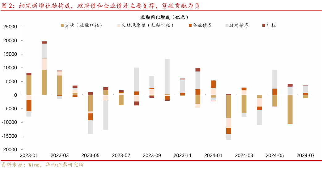 据1-7月累计值计算7月社融口径新增人民币贷款-767亿元,是新增社融同比最大拖累项。从两个方面来看,一是7月是传统的信贷淡季,贷款环比减少是常态 。近十年7月新增贷款(社融口径)中位数6988亿元,较6月低58%。去年7月新增贷款(社融口径)也仅364亿元。 二是今年二季度打击手工补息 ,部分涉及空转的贷款可能对应核减,而季末月银行仍有冲量需求,跨季之后的7月或更容易受到核减影响,拖累新增贷款表现。